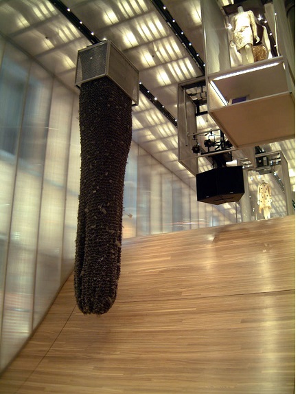 Conocer la tienda es una experiencia difícil de transmitir en palabras. El espacio es extraordinariamente único y singular. La notable inclinación del suelo se extiende a lo ancho de la tienda y se asemeja a una gran ola que conecta dos niveles. Además, se puede observar una extensa escalera de madera que también funciona como área de exhibición. Desde el techo cuelgan dispositivos de metal que sostienen las creaciones de la marca, y dado que son construcciones invertidas, generan la sensación de una cuidad suspendida en el aire.